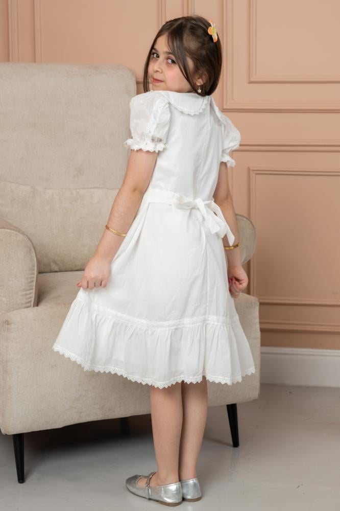 👗 يتميز بياقة دائرية واسعة مطرزة، وأكمام قصيرة منتفخة مع لمسات دانتيل تضيف لمسة كلاسيكية ساحرة.
