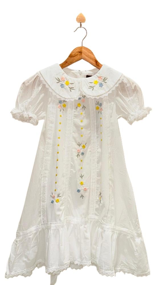 👗 Designed with a wide embroidered round collar, puff short sleeves with lace accents for a charming classic touch.