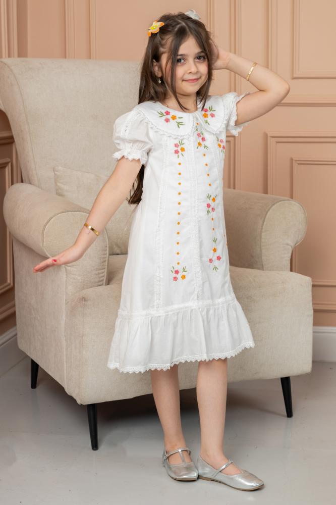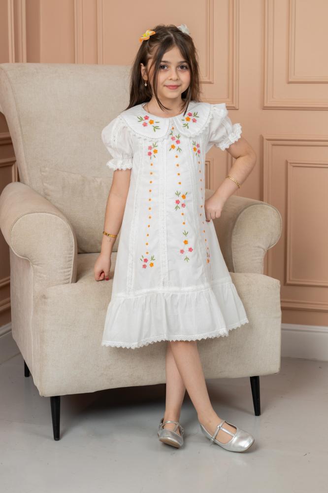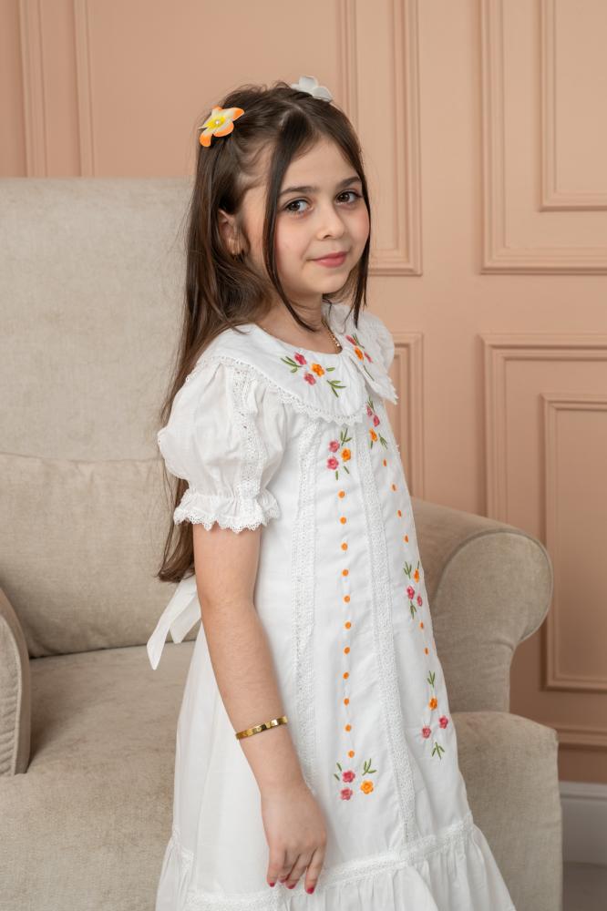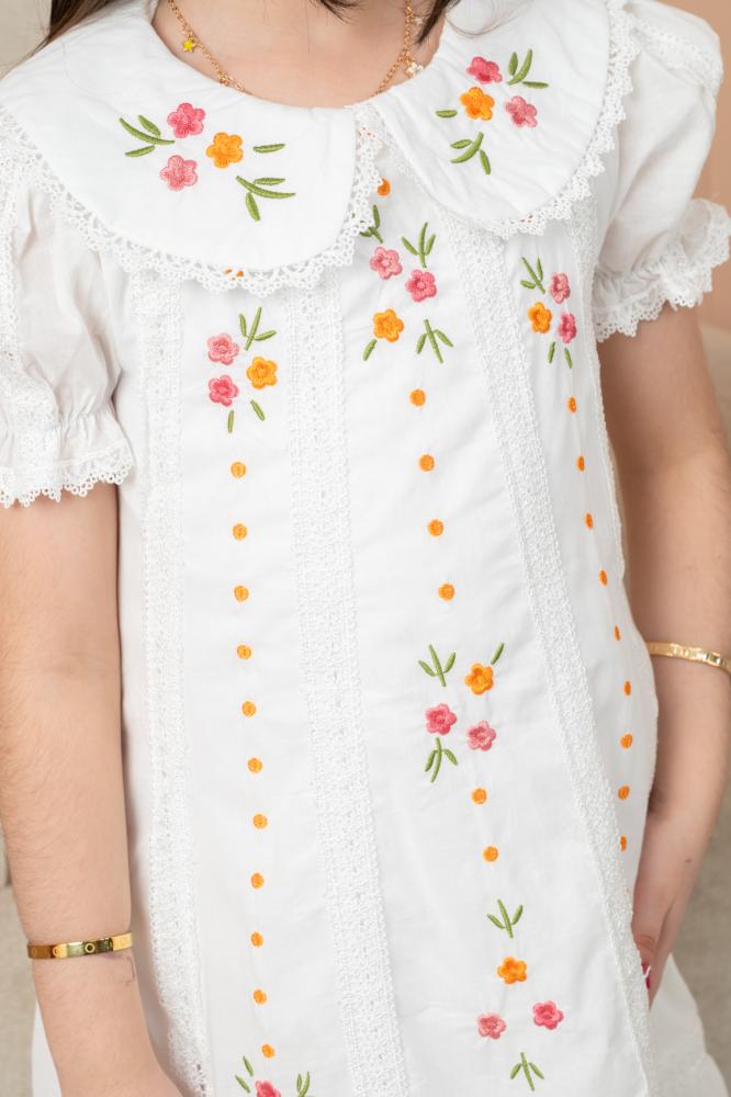 فستان أبيض أنيق مطرز بالزهور، بتفاصيل يدوية ناعمة بألوان زاهية مثل الوردي والبرتقالي 🌸🌿.