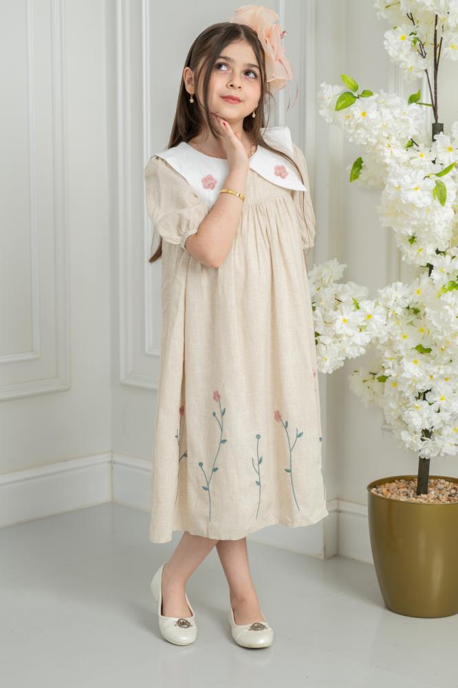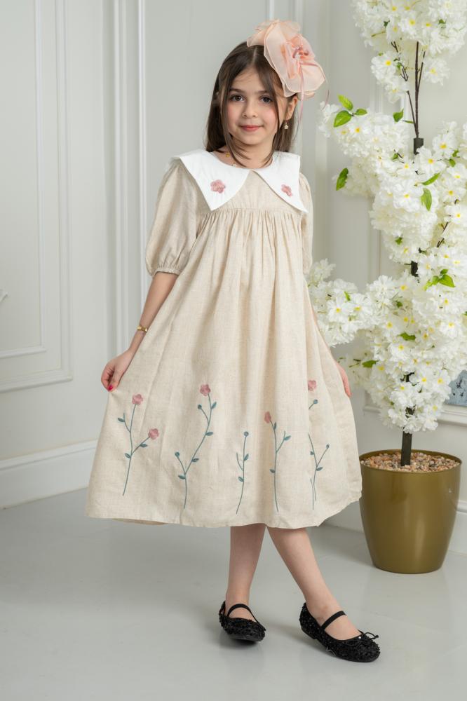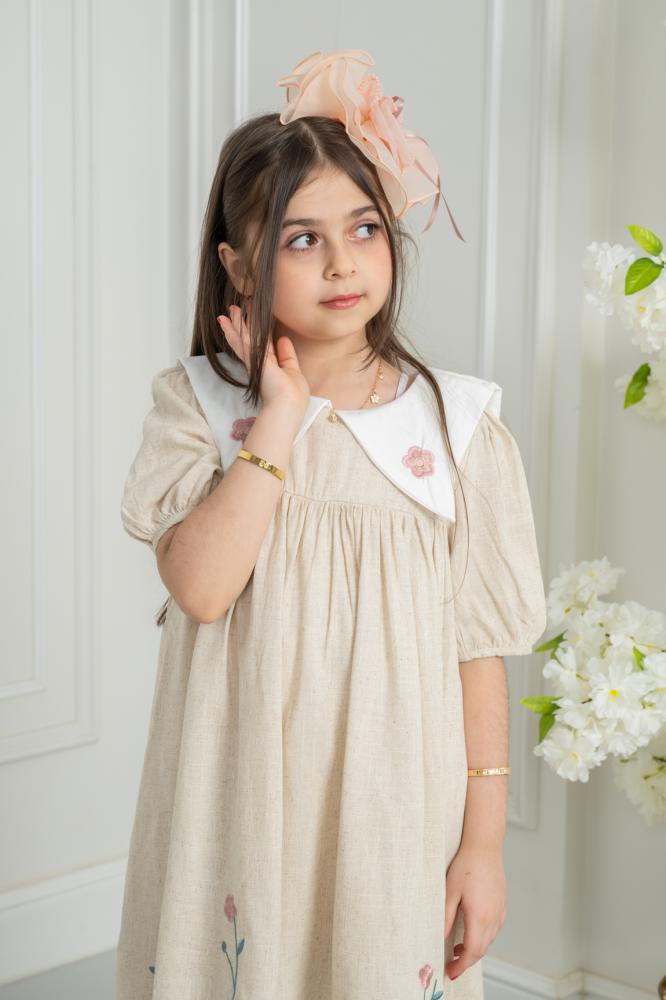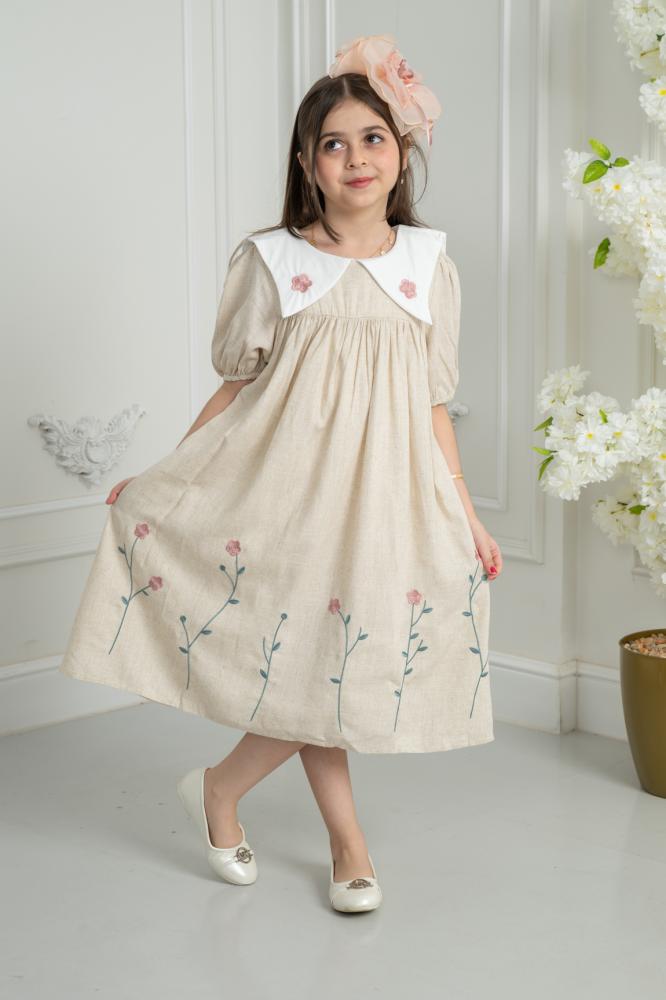فستان كتان بلون بيج طبيعي لزهور ناعمة على الحافة السفلية، وياقة بيضاء مزينة بورود وردية تضيف براءة وأناقة طفولية لا تقاوم 🌷